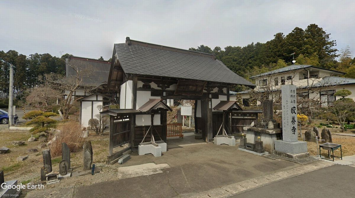 戦国時代には既に衰微し荒廃していましたが、永正14年(1517)に当時の曹洞宗の大本山だった能登国總持寺(現在は神奈川県に移転し、跡地は總持寺祖院となっています。)から日桂順東大和尚が当地に遷り住み曹洞宗の寺院として改宗開山し、總持寺の直末寺となっています。 慶長16年(1611)に初代仙台藩の藩主伊達政宗に従った後藤信康が不動堂領226石で配され、その跡を継いだ後藤近元が加増を受け2千石で不動堂要害(西舘)を拠点に定め当地に赴任すると、元和6年(1620)に山号を「月洲山」、寺号を「皎善寺」に改め歴代後藤家の菩提寺となっています。 嘉永元年(1848)に火災により多くの堂宇が焼失し、当時の建物は元禄年間に建てられたと伝わる山門のみとなっています。 山門は切妻、銅板葺き、三間一戸、薬医門形式、外壁は真壁造り白漆喰仕上げ、腰壁は下見板張り。 本堂は木造平屋建て、入母屋、銅板葺き、平入、正面1間唐破風向拝付、外壁は真壁造り白漆喰仕上げ。 霊廟門は不動堂要害(西舘)の内門を移築した建物で不動堂要害(西舘)の唯一の遺構として貴重な存在です。 境内背後に高台には後藤家歴代の墓碑が建立されている他、文豪千葉亀雄の墓や大仏寺の経塚等が残されています。本尊:釈迦如来。 皎善寺(宮城県美里町):動画